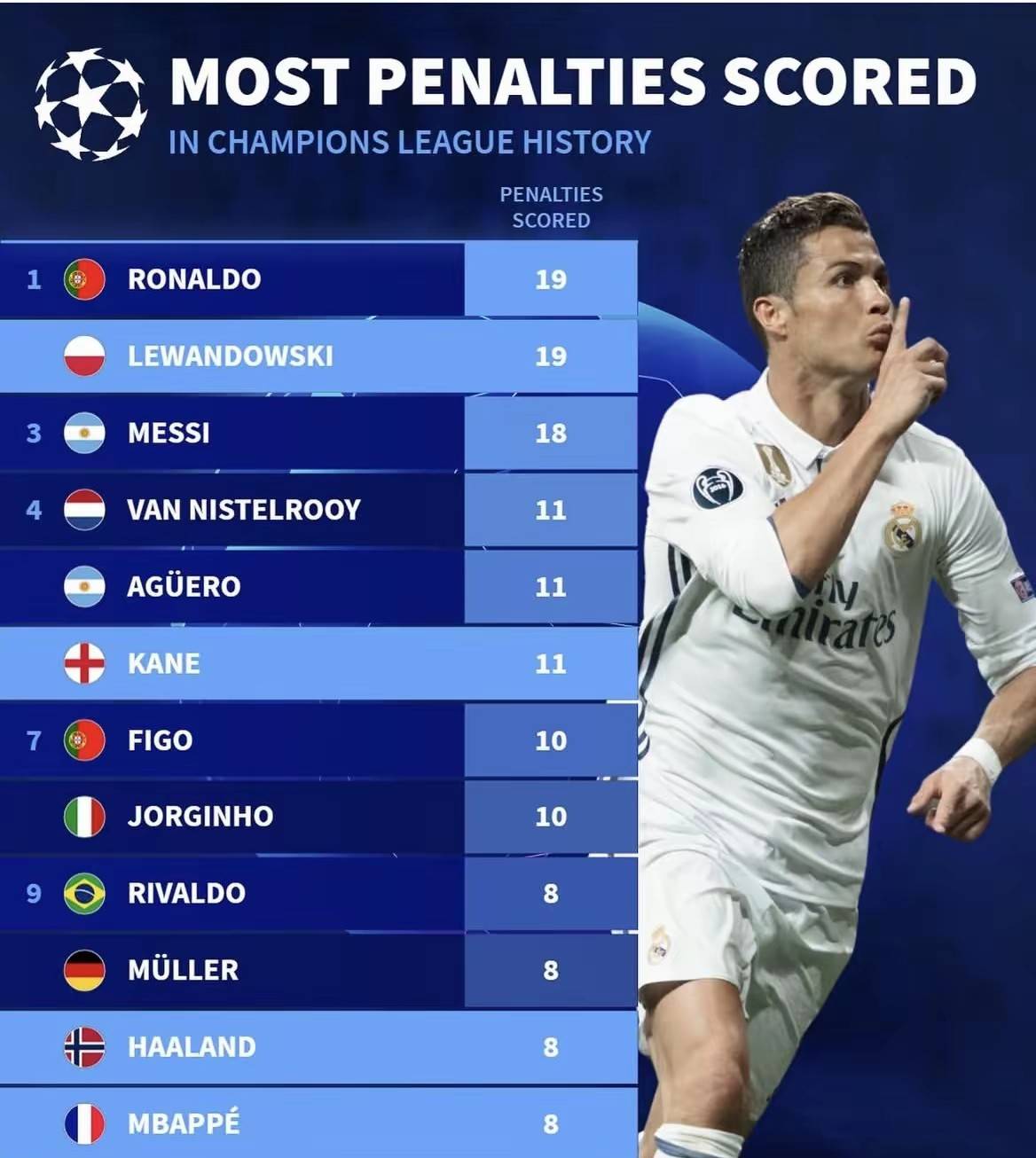 ,先看一下欧冠联赛点球数量排行榜: